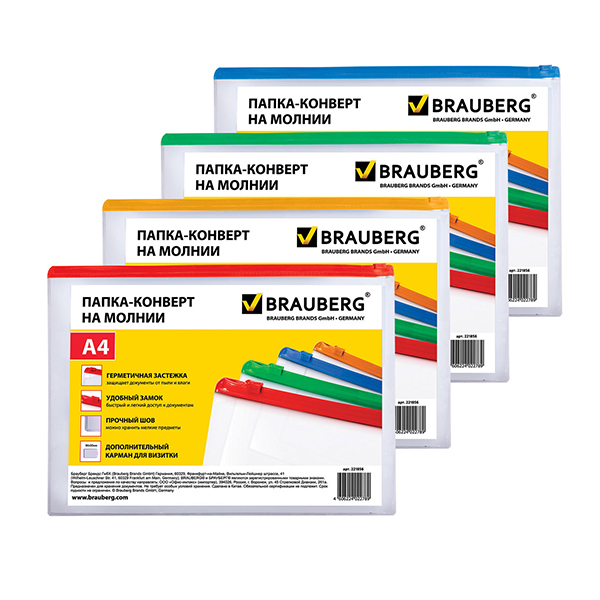 16. Канцелярия » 16.3. Офисные принадлежности » 16.3.2. Папки и системы архивации » Папка-конверт на молнии Brauberg "Smart", А4, 335*238мм, 150мкм, карман для визитки [221856] [/12]*