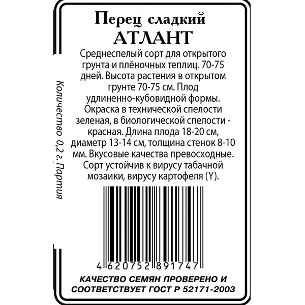 07. Для дачи » 7.3. Все для выращивания » 7.3.4. Семена » 7.3.4.2. Семена белая пачка » 7.3.4.2.1. Овощи б/п » Перец сладкий [Атлант] [0.2г] [б/п] [ССС] [/20]*